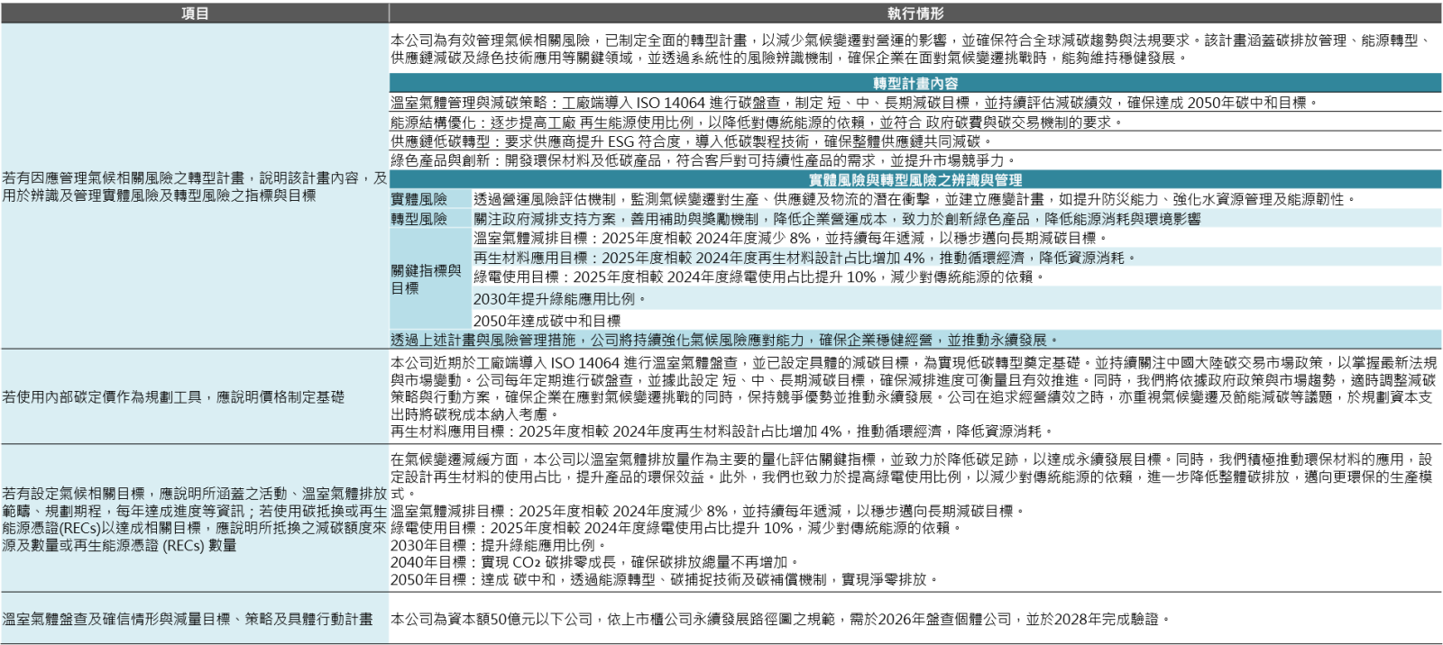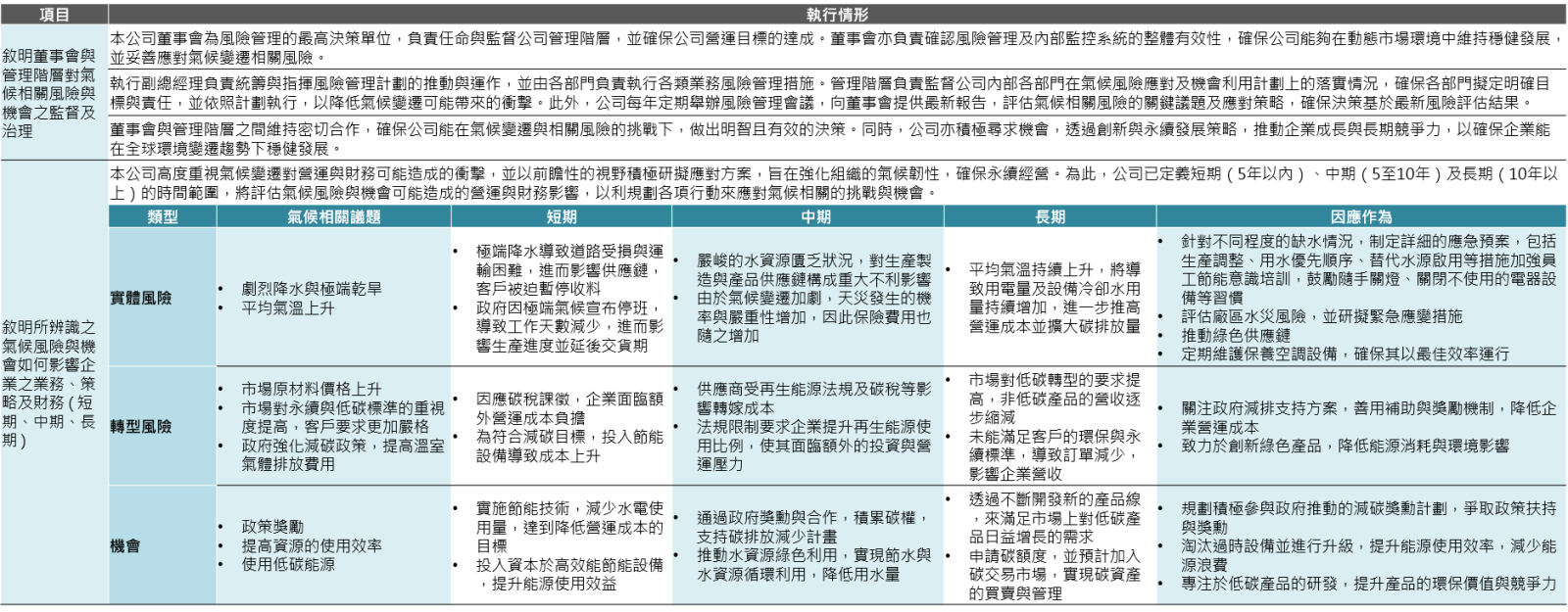 變遷已成為21世紀最嚴峻的全球挑戰之一。極端氣候事件的頻率與強度持續增加,對全球環境、經濟與社會穩定構成重大威脅。本公司深知氣候變遷對營運及供應鏈的潛在衝擊,並視其為影響長遠發展的關鍵議題。為有效因應,我們依據氣候變遷相關議題,針對監督與治理、風險與機會評估、策略與目標等面向,持續檢視與精進相關措施。以下將分列說明各項執行情形: