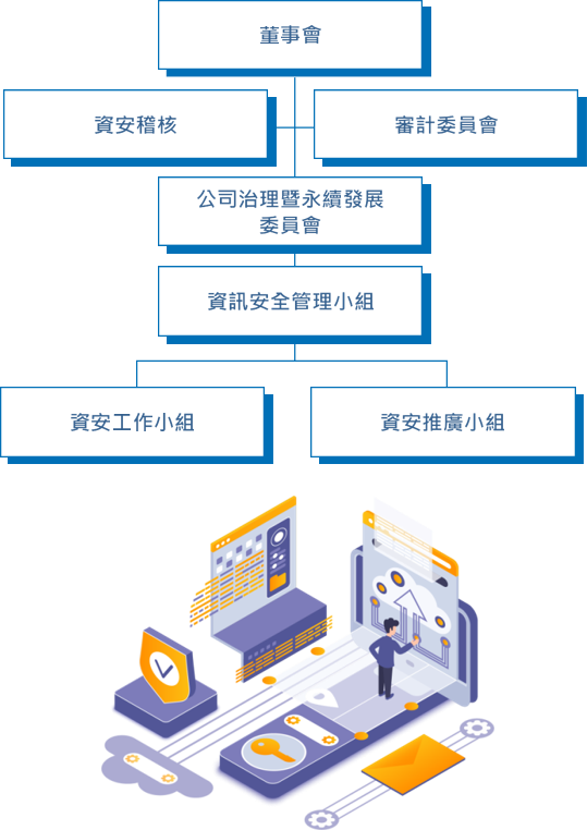 本公司於2022年3月8日正式通過公司治理主管的編制,並成立了「公司治理暨ESG永續發展委員會」。在此委員會的風險管理小組之下,設立了「資訊安全管理小組」,由資訊主管擔任召集人,全權負責統籌資訊安全相關政策的制定、執行、風險評估及遵循度查核。為確保最高管理層的監督,公司治理主管每年會將資訊安全的管理成效、重大議題及未來發展方向,向審計委員會及董事會進行專案彙報。
