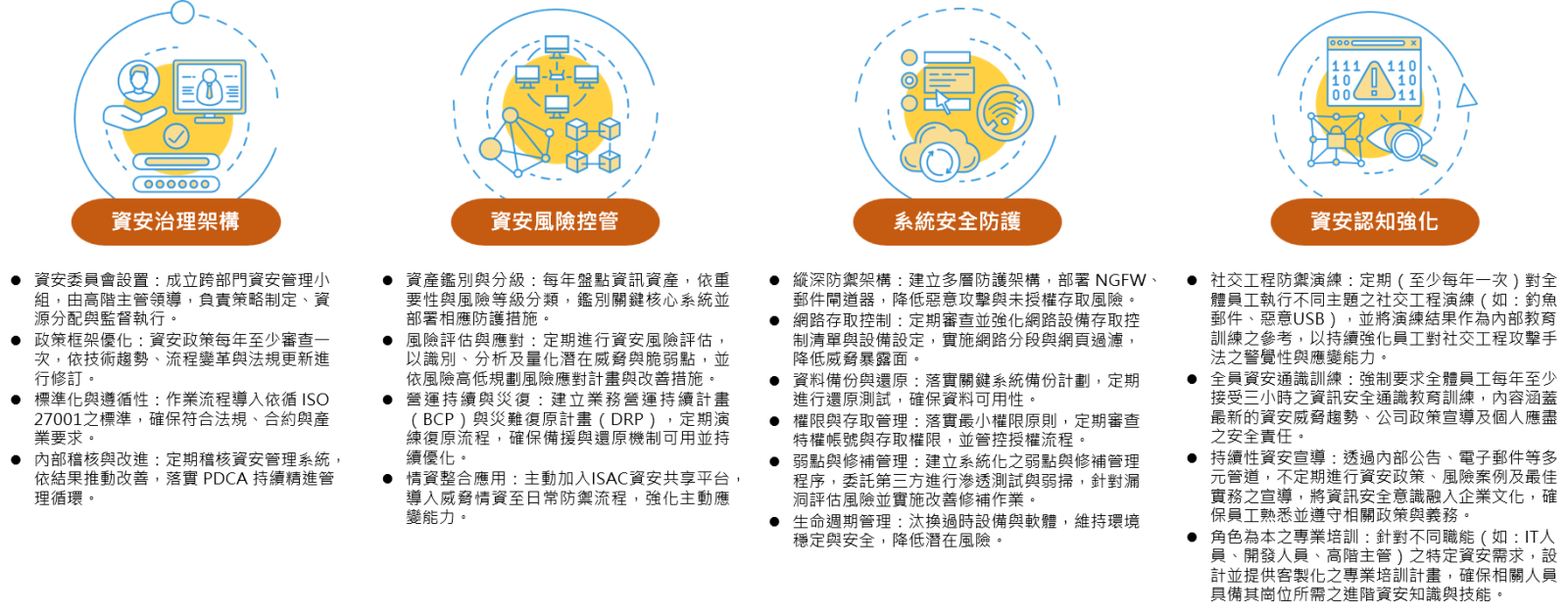 為確保本公司資訊資產之機密性、完整性與可用性,並建構一個具備高度韌性與防禦能力的資安環境,本年度持續投入多層次資源,其具體執行成果分述如下: