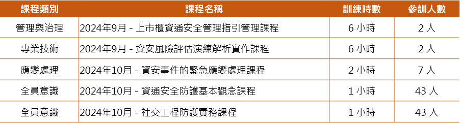 為確保資安政策能有效落地,本公司致力於提升全體同仁之資安意識及專責人員之專業技能,2024年度訓練成果如下: